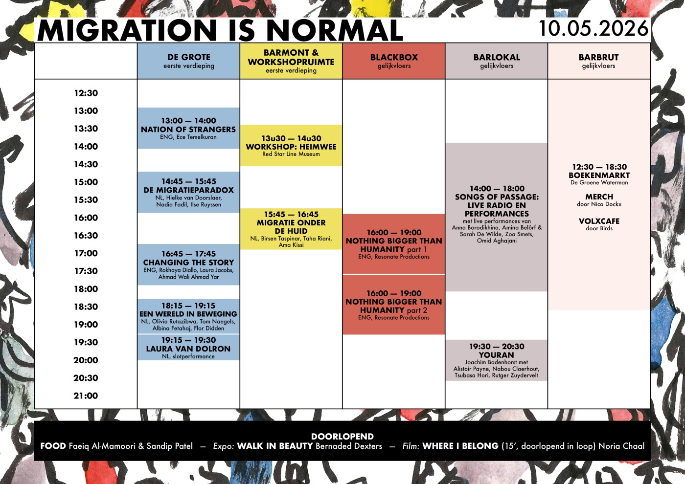 We laten het ook bruisen. We vieren migratie in al haar vormen en dat met muziek en performance. We serveren heerlijk eten dat verhalen draagt, tonen kunst en films, presenteren boeken en versterken betekenisvolle ontmoetingen.